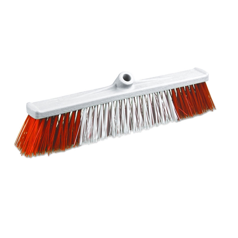 Щетка для подметания с жесткой щетиной. Отверстие с резьбой под углом 45 градусов под ручку. Щетина: жесткая. Материал: основа - пластик, щетина – полипропилен.