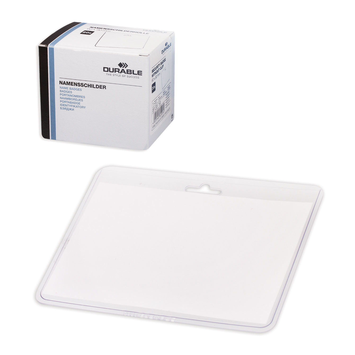 Открытый на одну треть карман для бейджа Durable размером 60 х 90 мм. Из прозрачного ПВХ со сменным вкладышем. Может использоваться с текстильной тесьмой, с вращающимся клипом, с рулеткой.