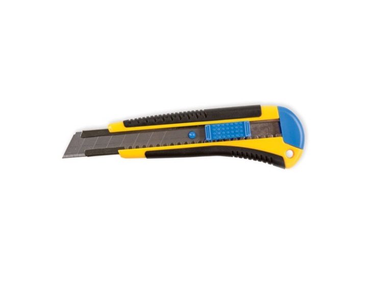 Мощный усиленный нож желтого цвета, с прорезиненным корпусом. Имеет отверстие для подвешивания на гвоздь, веревку или т.п.