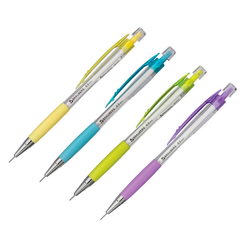 Карандаш с нажимным механизмом заправлен грифелем HB, всегда заточен и готов к работе, дает ровную линию 0,5 мм. Цанга карандаша убирается внутрь корпуса, поэтому даже на дне сумки или пенала такой карандаш не сломается. Поставляется в нескольких вариантах цвета (без возможности выбора).