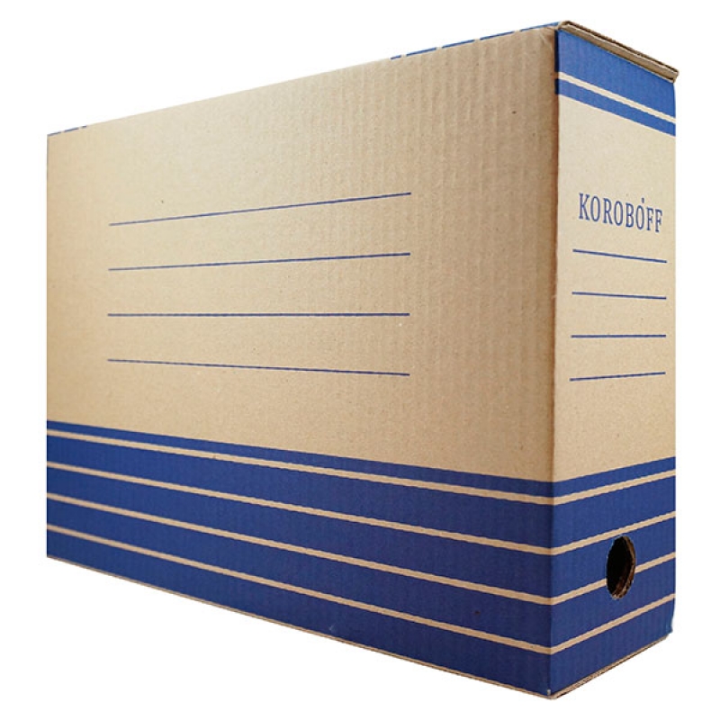 Короб из плотного картона. Позволяет хранить документы А4 формата на стеллажах. Имеется удобное отверстие для захвата при изъятии с полки, линованный идентификатор на корешке для подписи. Закрывается с помощью замка.