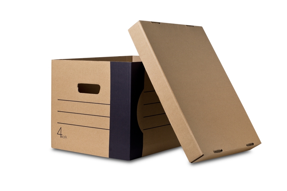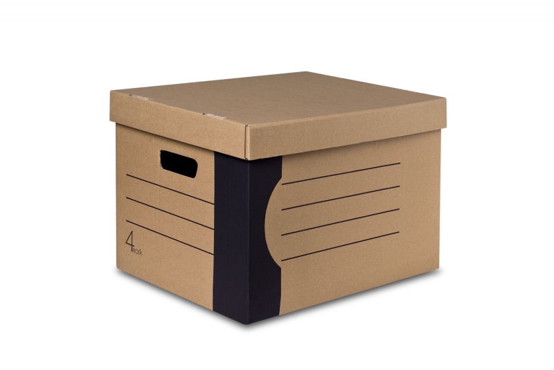 Короб изготовлен из прочного гофрированного картона. Ручки на боковых стенках облегчают перенос коробки, линованный идентификатор на каждой стороне для возможности нанесения описания.