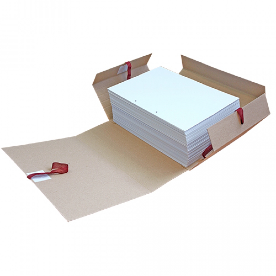 Папки скоросшиватели на завязках изготовлены из немелованного картона повышенной плотности с различной шириной корешка от 40 до 150 мм, что позволяет в одном изделии хранить определенное количество бумаг: до 1500 листов в папке. Документы в папке ударживаются клапанами с завязками. Ключевое отличие этих папок от стандартных папок-скоросшивателей - наличие креплений (клапанов) и завязок для дополнительной фиксации докуметов. Имеется усовершенствованный механизм для сшивания европейского качеств. Представлены в формате А4. Плотность картона 620 г/м2, толщина картона 0,9 мм.