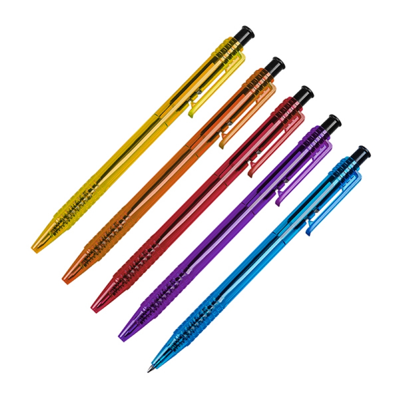 Корпус изготовлен из пластика с ребристой зоной захвата, препятствующей скольжению пальцев. Нажимной механизм подачи стержня (для разбора ручки необходимо нажать на кнопку под клипом). Стержень: длина 132 мм (с упором), наконечник пулевидный, толщина линии письма 0,7 мм. Длина письма - 1300 м.